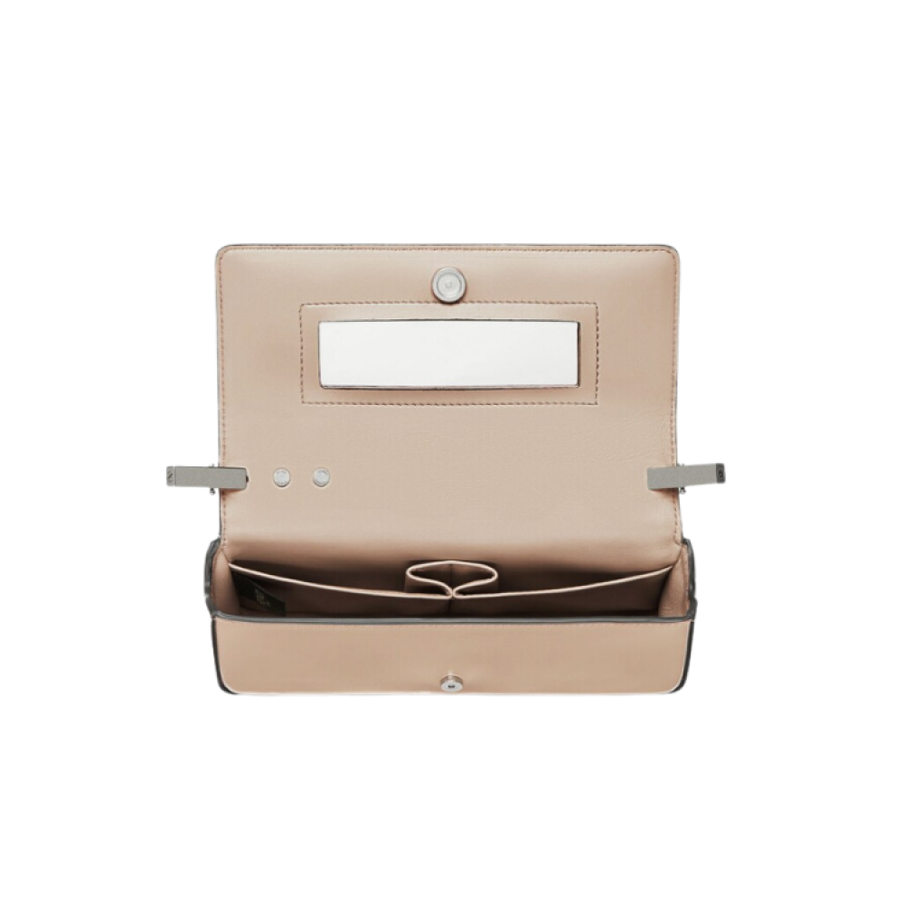 مصنوع من جلد العجل اللامع ، ويتم تثبيته بإطباق مغناطيسي ومزين بشعار. إنها كاملة بمقبض سلسلة نصف دائري ، وحزام قابل للفصل والضبط ، وأجزاء معدنية فضية اللون وجزء داخلي واحد بجيبين منزلقين ومرآة مستطيلة.