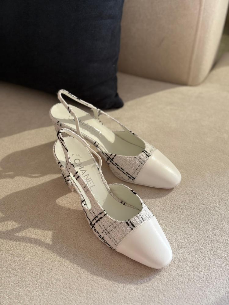 مزايا حذاء كعب شانيل قماش لون أبيض وأسود
