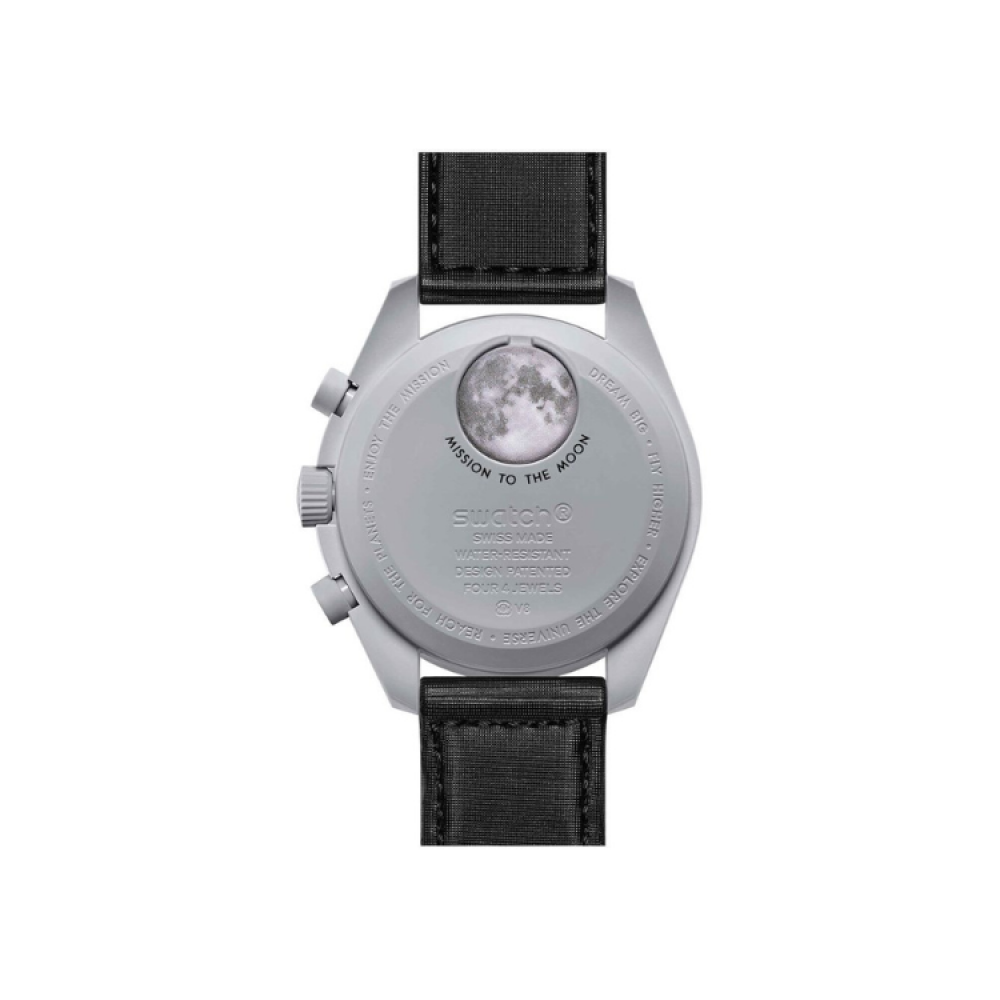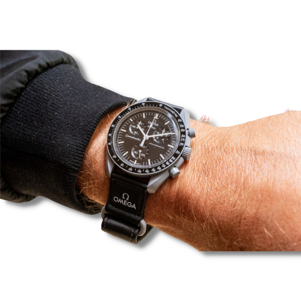 ساعة موون وتش من أوميغا سواتش، ساعة يد، مصنوعة بمواد عالية الجودة، سوار جلد أسود، تصميم عملي أنيق، ساعة راقية و جذابة، صممت لتناسب مختلف الأوقات، متميزة و فخمة.