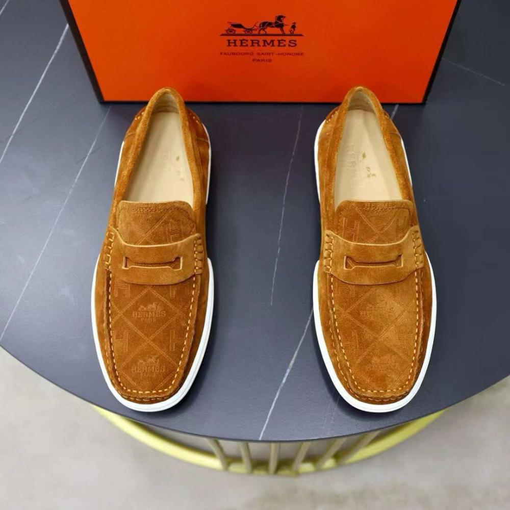 شوز الشامواه الفاخر للرجال من هيرميس، بلون عسلي يضفي لمسة من الرفاهية والأناقة الكلاسيكية، مع شعار الماركة المميز.