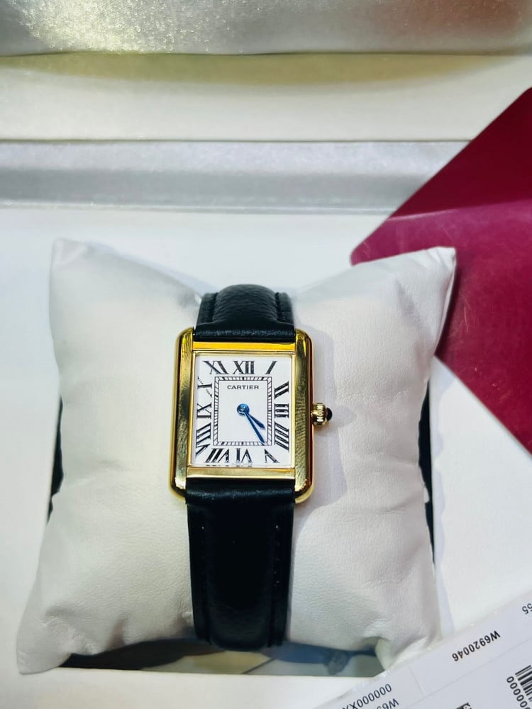 ساعة كارتييه مستطيلة - جلد أسود إطار ذهبي