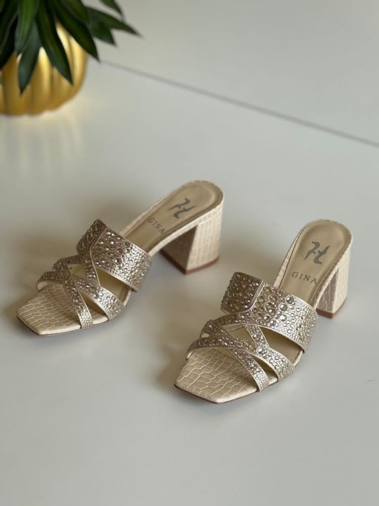 دللي نفسكِ بشبشب جينا الفاخر بكعب عريض ذهبي، وارتقي بإطلالتكِ إلى مستوى جديد من الأناقة والجمال.