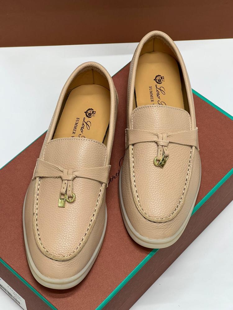ارتقي بأناقتك مع حذاء الفلات النسائي الفاخر من لورو بيانا. مصنوع من جلد بيج عالي الجودة، هذا الحذاء يجمع بين الأناقة والراحة في تصميم واحد. يتميز بشعار لورو بيانا الذهبي الذي يضفي لمسة من الفخامة على كل خطوة.