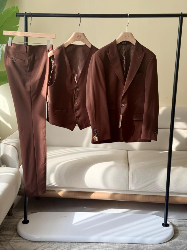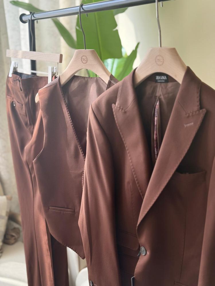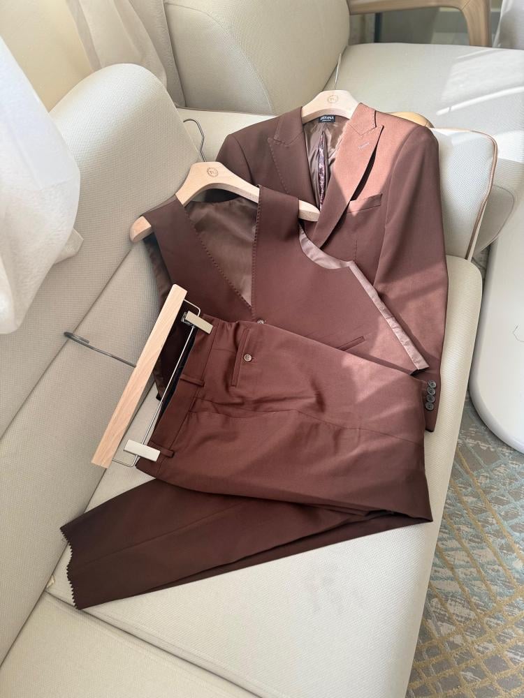 طقم ثلاث قطع رجالي زينيا بلايزر وفيست مع بنطال بني – تجربة لا تُضاهى