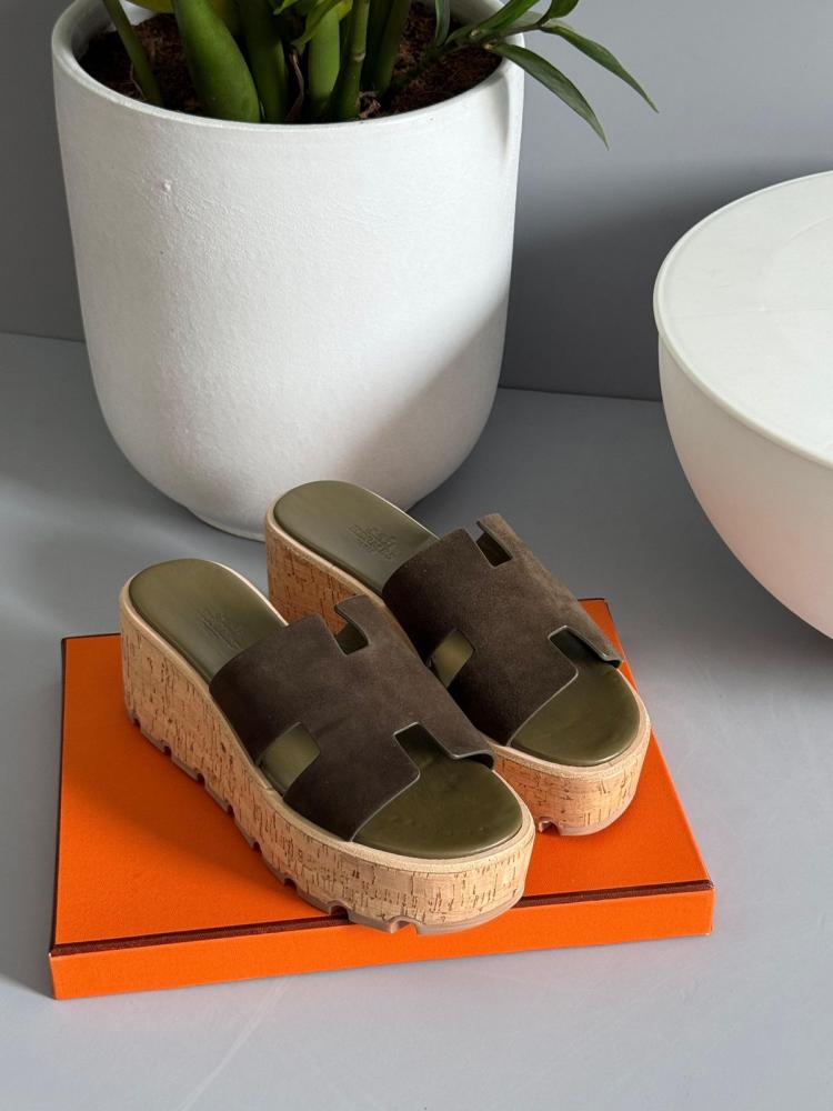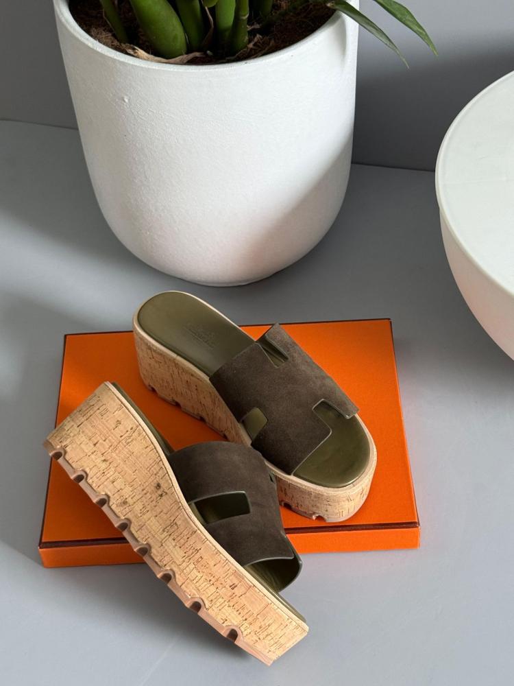صندل Hermès Eze 30 بنعل فلين سميك ولون زيتي، يجمع بين الفخامة والبساطة بلمسة صيفية أنيقة.