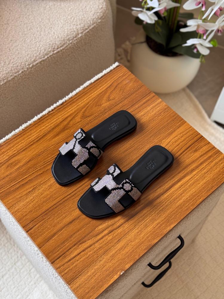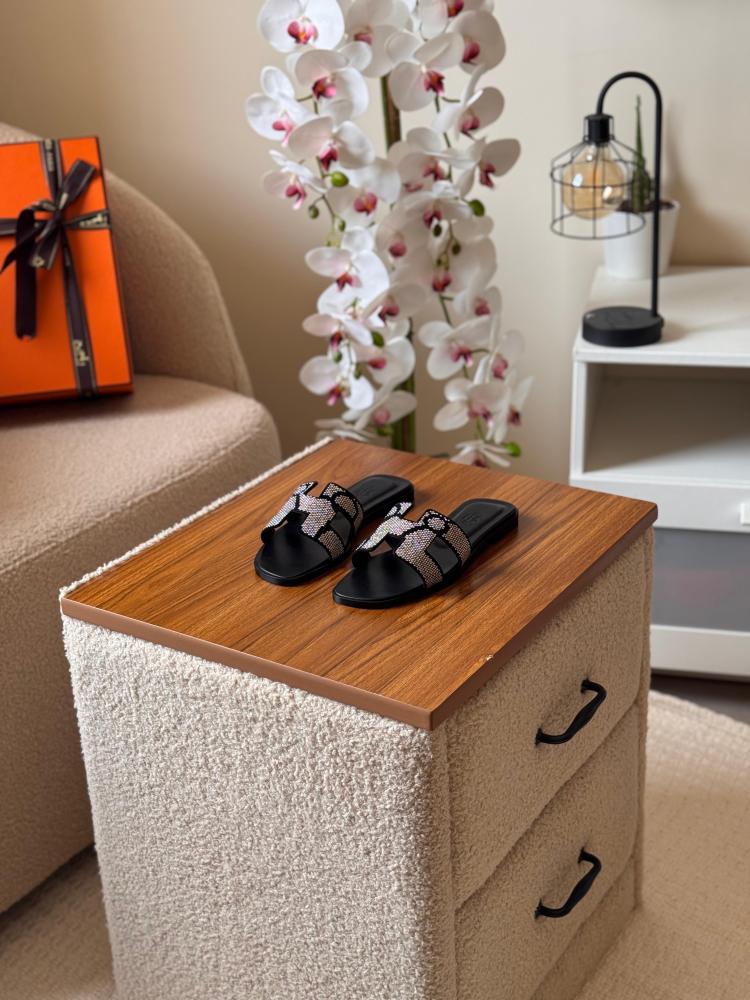 تألقي بأناقة هادئة مع شبشب إيرمز أوران الفلات باللون الأسود والمزين بستراس أبيض