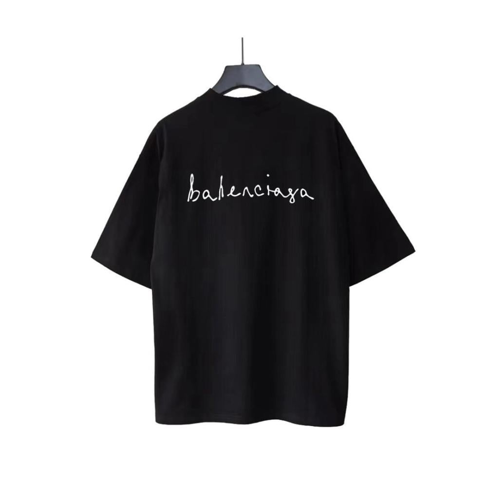 "قوة التصميم تلتقي مع أناقة الرجل العصري – تيشيرت بالنسياجا الأسود بطبعة بيضاء يرفع حضورك ويعكس ثقتك في كل مناسبة."