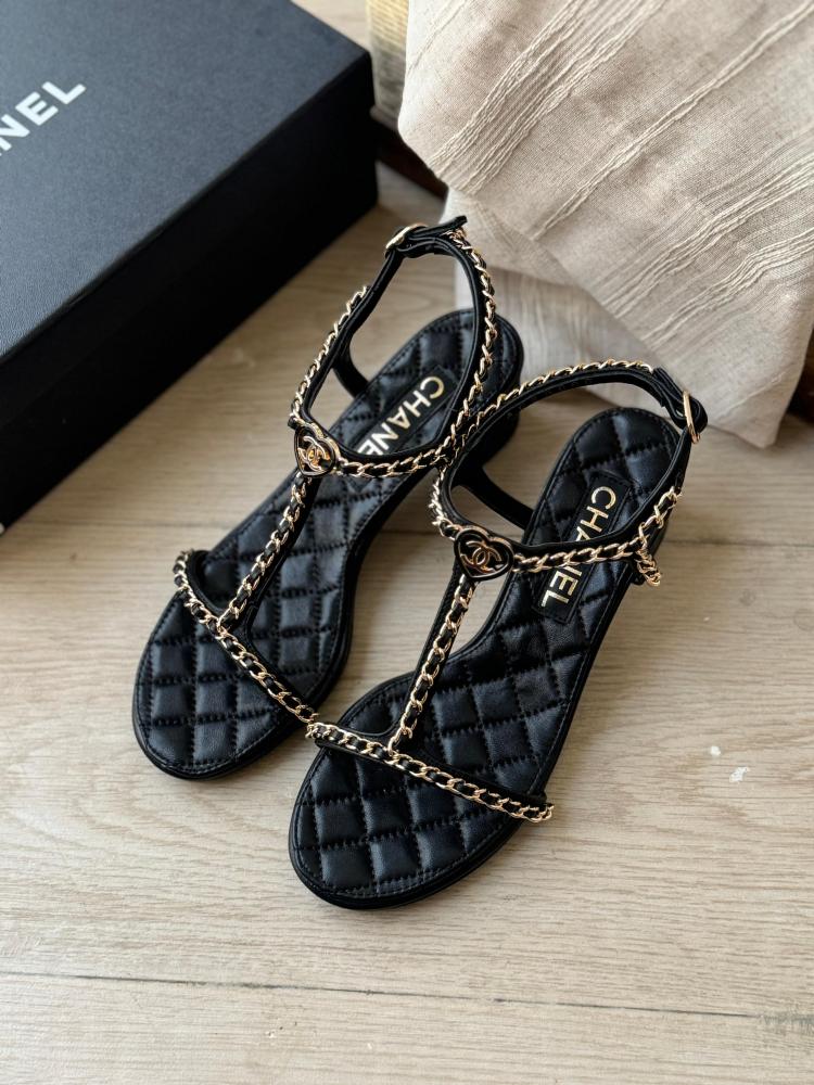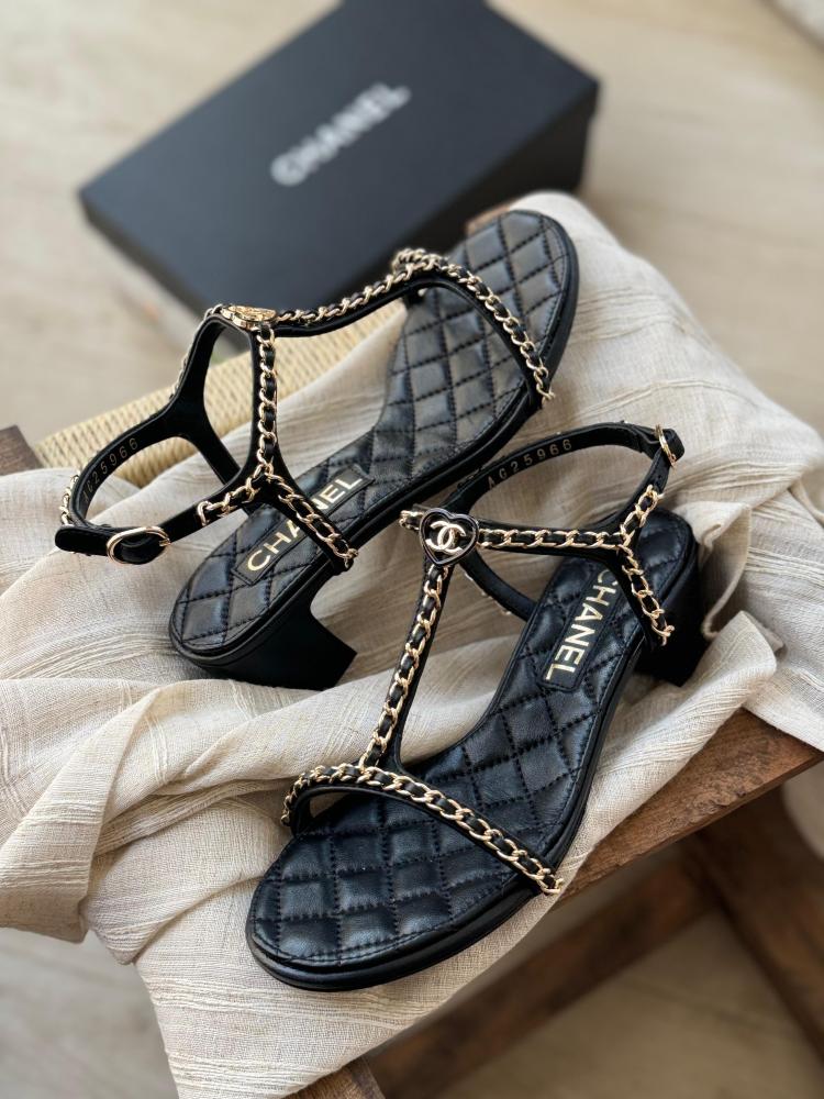 صندل شانيل كعب متوسط بحزام خلفي بلون أسود أنيق مع لمسات معدن ذهبي فاخر، يجمع بين التصميم الكلاسيكي والعصرية ليمنحك إطلالة مميزة.