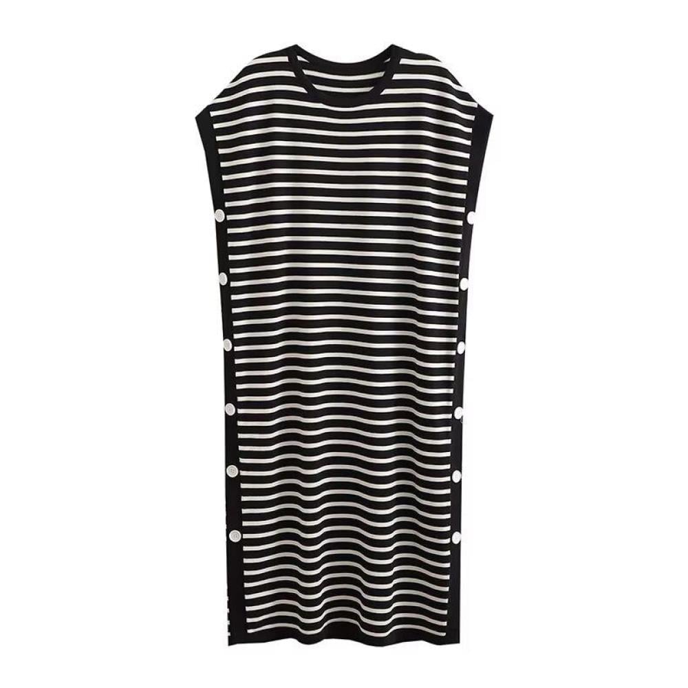 فستان سبور نسائي ساندور نمط مخطط بأزرار جانيبة أبيض وأسود