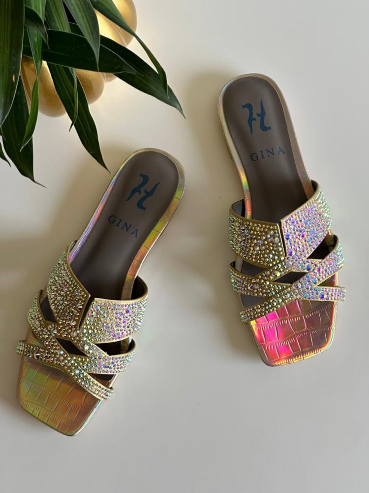 استعدي لتجربة فريدة من نوعها مع شبشب جينا النسائي ذو اللون الذهبي الأنيق والمثير، مع تفاصيل ستراس اللامعة التي تضفي عليه لمسة من الفخامة والأناقة.