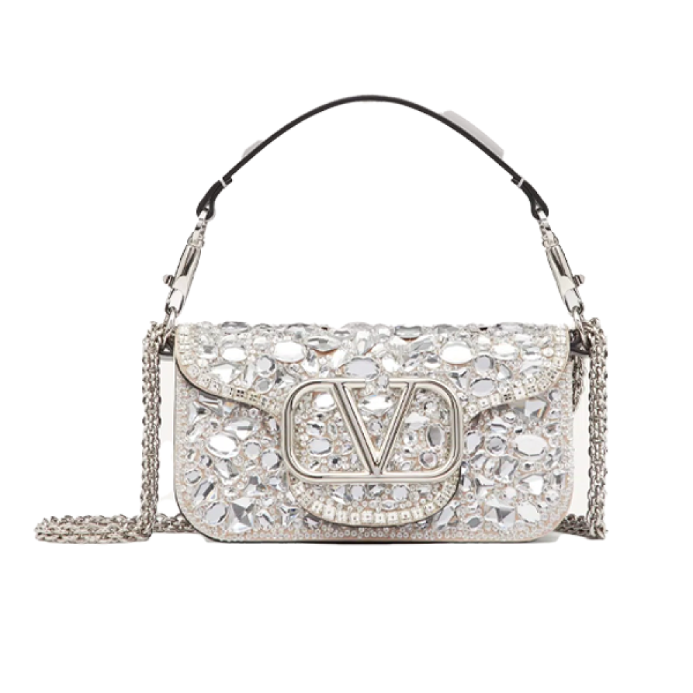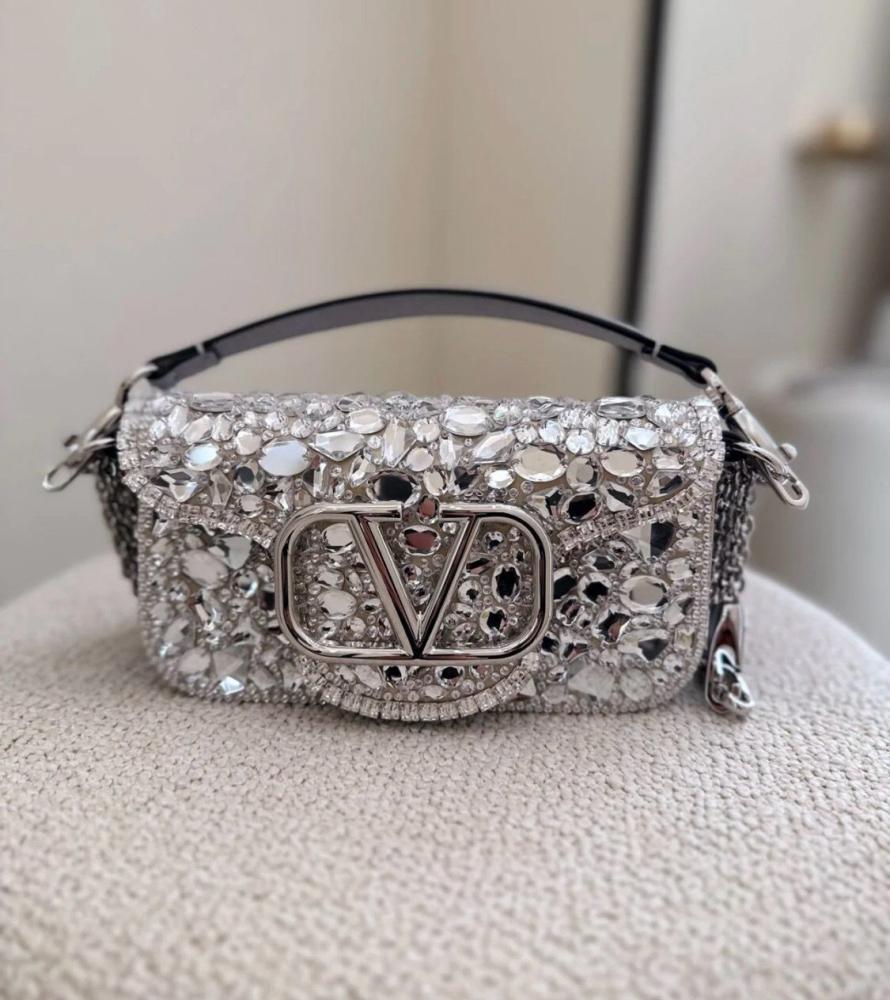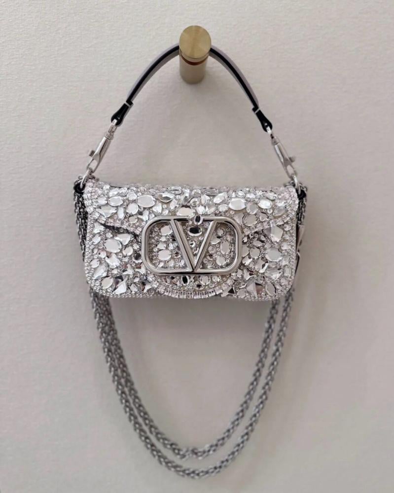 اختاري التميز مع حقيبة السهرة فالنتينو لوكو الراقية بلونها الفضي المرصع بالكريستال، المصممة لتمنحك لمسة فخامة في كل مناسبة.