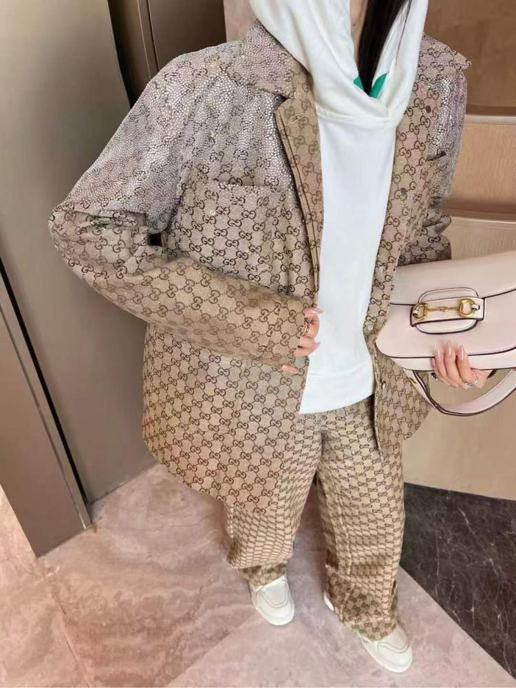 Be the most elegant on every occasion with this Gucci GG women's formal suit , consisting of pants and a jacket with an elegant design in brown and beige , to give your look a touch of luxury and distinction! 🌟👗