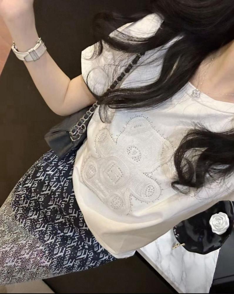 Fendi's sporty everyday set: a short skirt and a cute white teddy bear T-shirt —precision and elegance in one design! With this modern set, you not only get a youthful and relaxed look, but also enjoy the finest details of luxurious fashion. It's crafted from high-quality materials to provide an unparalleled experience in your everyday looks.