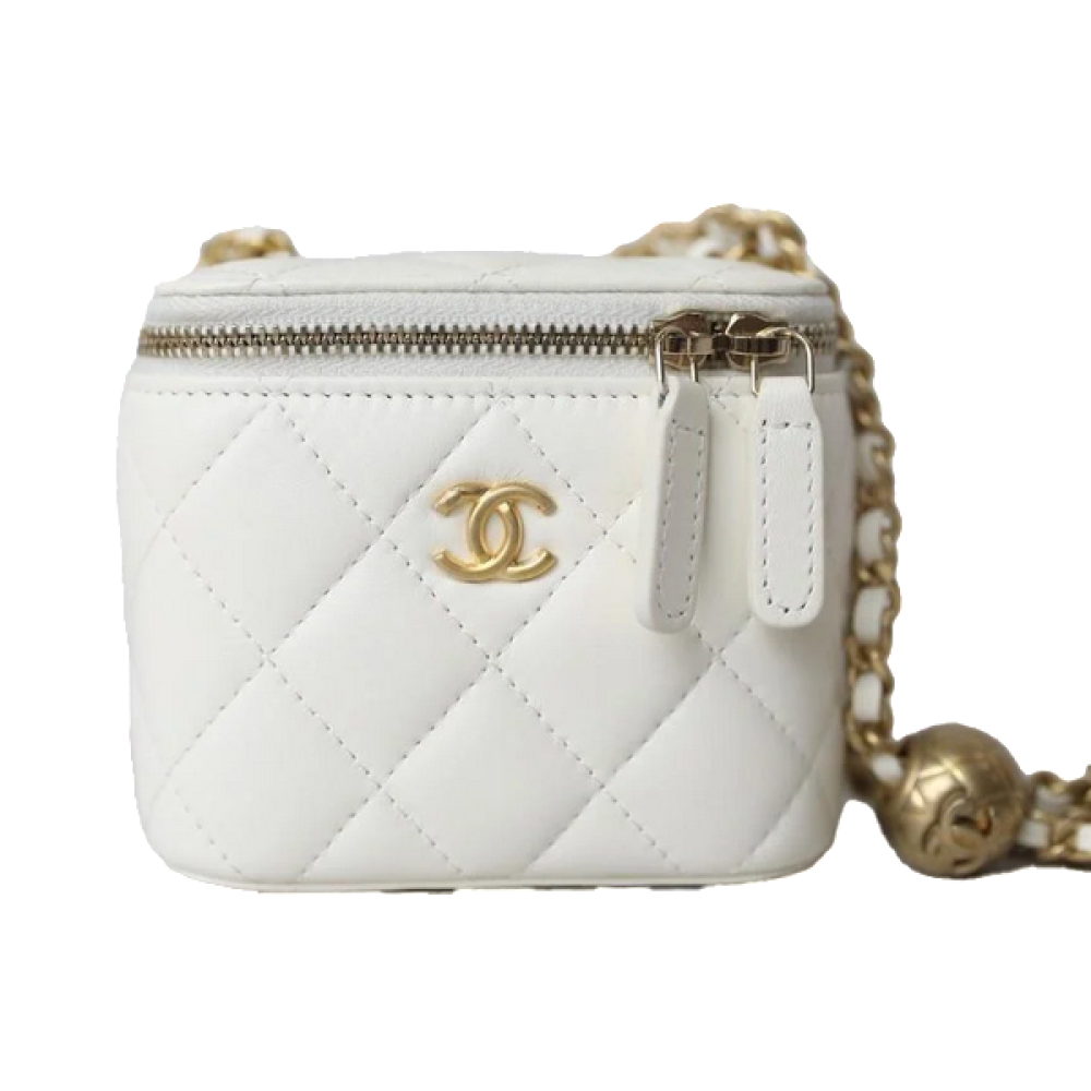 Shine bright with this small white Chanel vanity bag, designed to be your perfect companion for every occasion. This bag features a classic, quilted design that exudes luxury and sophistication. The gold chain adds a touch of elegance, making it the perfect choice for an elegant and attractive look.