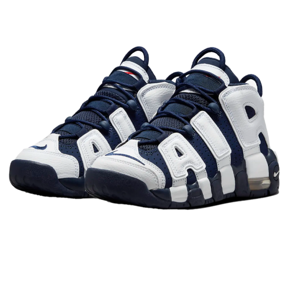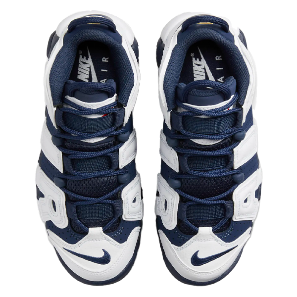The Nike Air More Uptempo Basketball Shoe in Navy and White is your perfect choice for high-performance athleticism and distinctive style on the court.