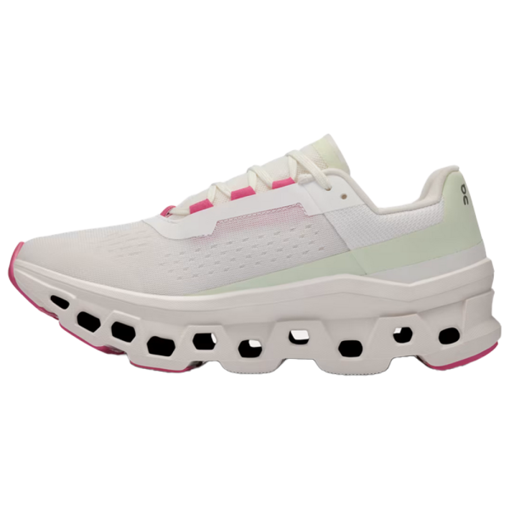 Experience unparalleled comfort with the On Cloud Monster shoe, designed to meet your athletic needs with a modern style. This shoe comes in a pure white color with pink accents, accented with a gray and green logo for a distinctive touch.