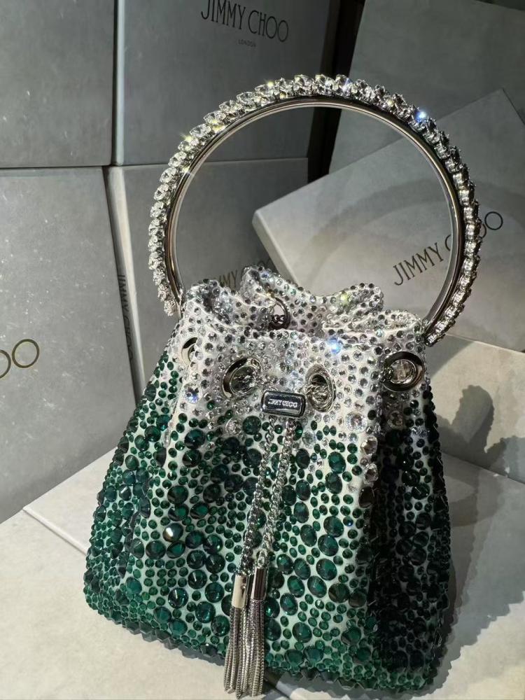 Jimmy Choo Bon Bon bag with metal handle and green and silver crystals
