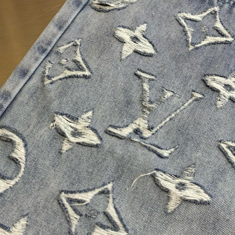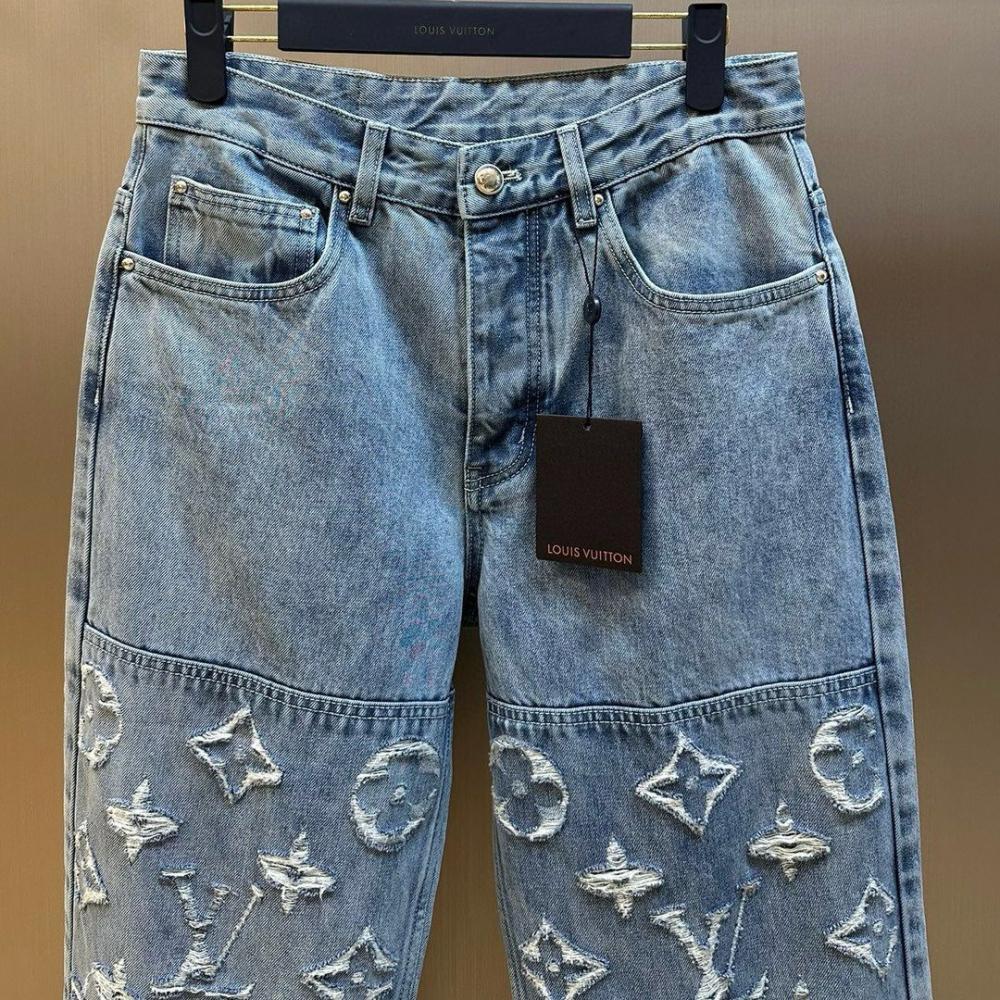 Louis Vuitton men's denim pants in classic blue, elegantly embellished with the brand's logos, adding a distinctive touch without being overpowering.