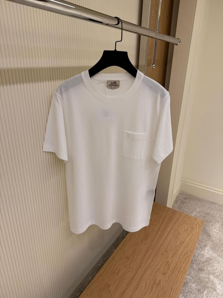 Hermes men's plain white T-shirt features a simple and elegant design with a small chest pocket that adds a practical and modern touch.