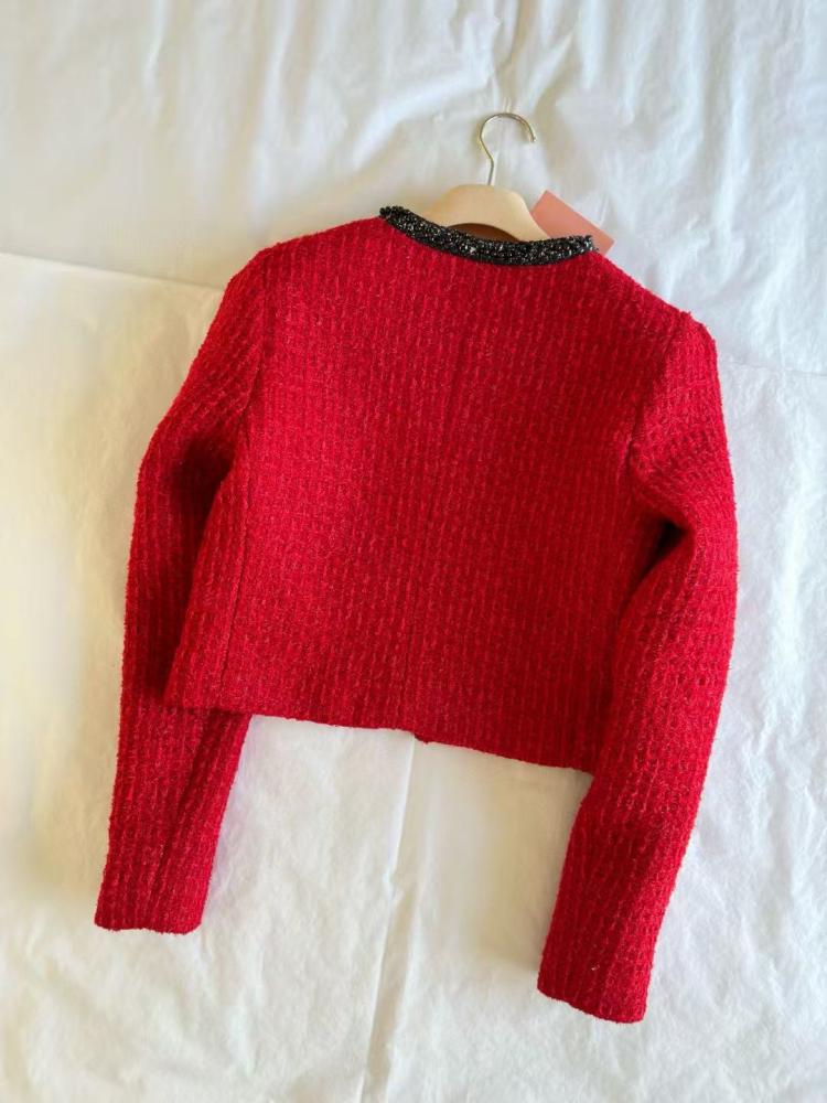 This Chanel Cars Coco cropped blazer in a luxurious red and black color combines classic design with a bold, modern touch.