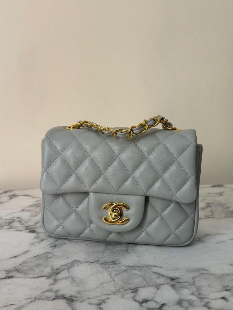 Classic Chanel women's bag, 17 cm, with a flap and chain in gray and gold.