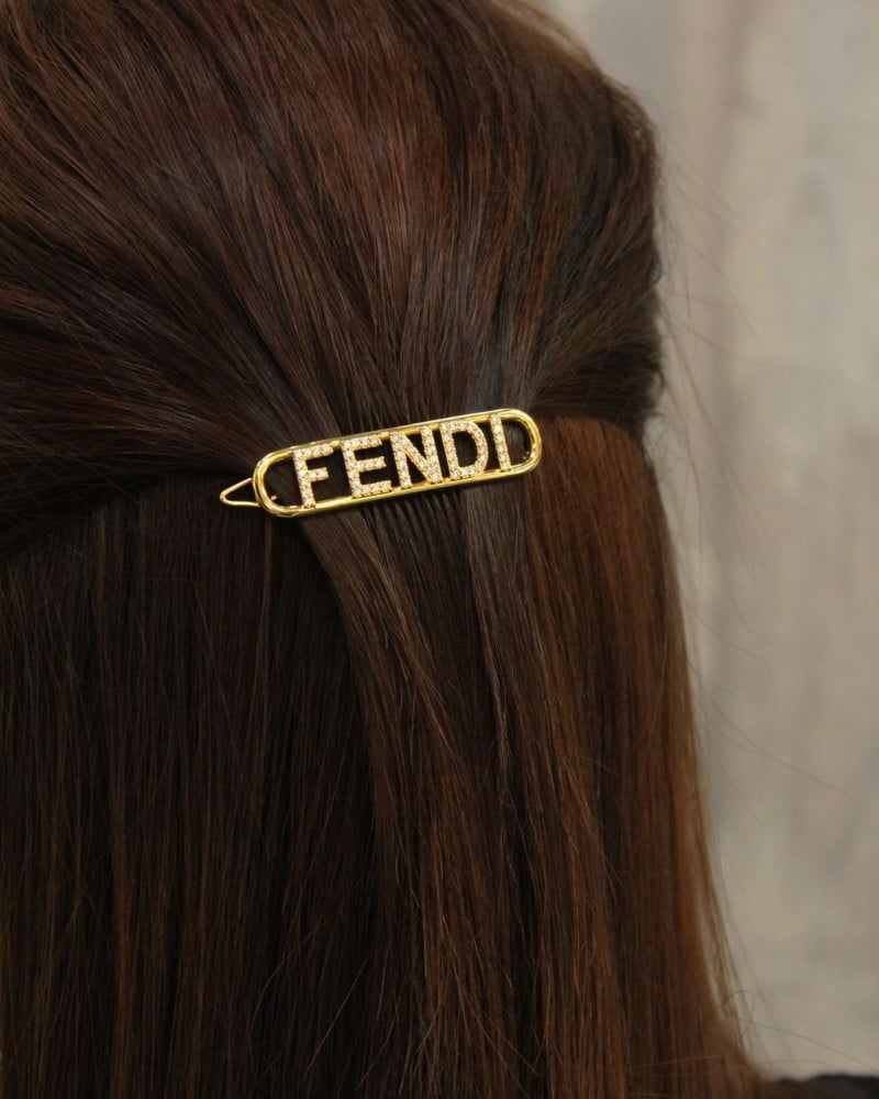 احصلي على لمسة من الأناقة والفخامة مع اكسسوار الشعر بشعار فيندي المطرز باللون الذهبي اللامع.