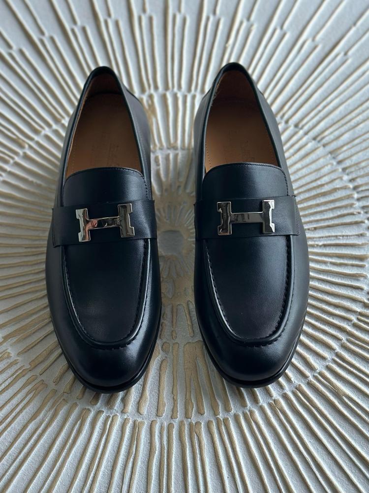 Hermes men's formal shoes are crafted from premium leather in elegant black, embellished with the brand's signature shiny logo, adding a subtle touch of luxury. A classic, sophisticated design reflects the taste of the modern man who appreciates quality and fine detail.