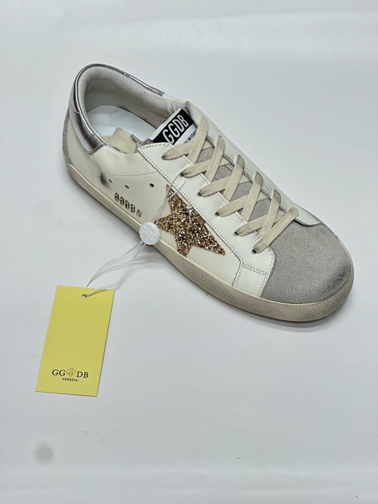Enchant everyone with your steps in the Golden Goose women's flat sneakers , featuring a combination of calm gray, pure white, and eye-catching gold glitter accents .