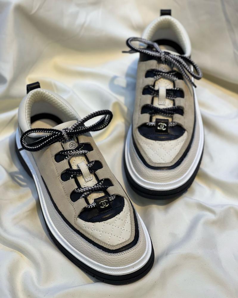 Enjoy a distinctive and modern elegance with these Chanel women's sneakers , designed in two stunning colors, beige and black , with elegant laces that highlight their sophisticated details. These sneakers combine comfort with luxurious design, making them an ideal choice for everyday looks or casual activities.