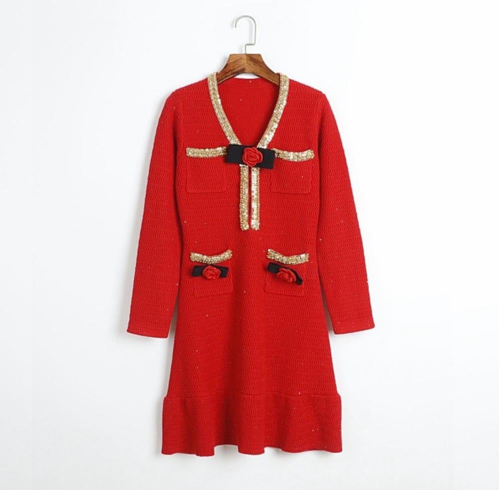 Designed with an elegant short cut and long sleeves, this dress is crafted from a high-quality woven fabric that combines cohesion and softness. It is adorned with gold trim around the collar and pockets, adding a regal touch. Four front pockets are decorated with red roses and black ribbons, adding a unique artistic touch that reflects the craftsmanship and precision of the design.