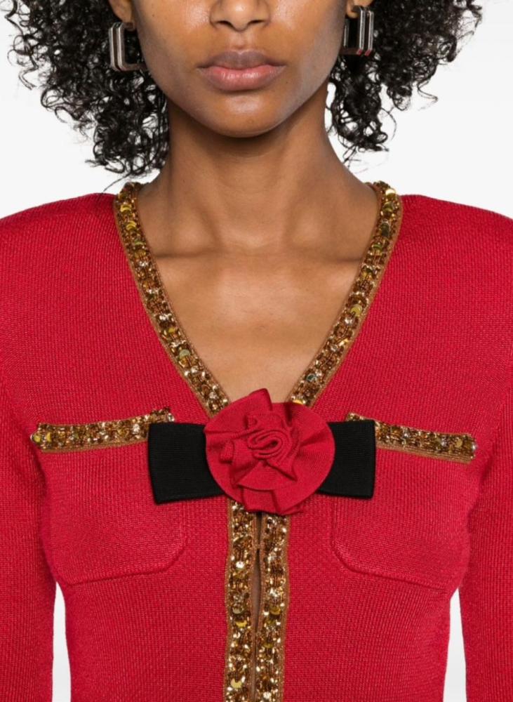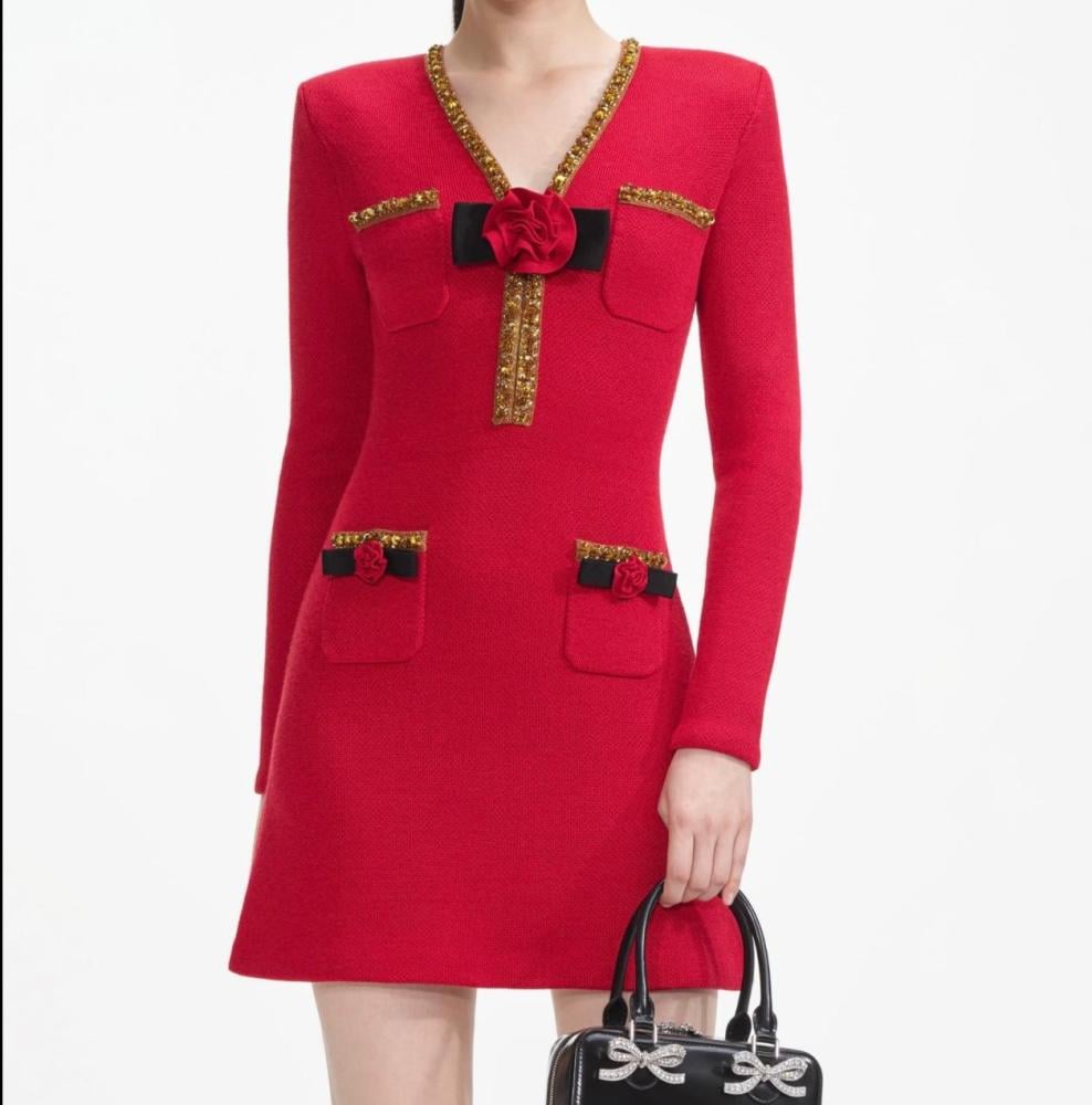 Shine with captivating elegance and sophisticated femininity with this Self-Portrait woven mini dress in deep red with luxurious gold detailing, from Eseven Store—a piece that celebrates your beauty and gives you an unforgettable presence.