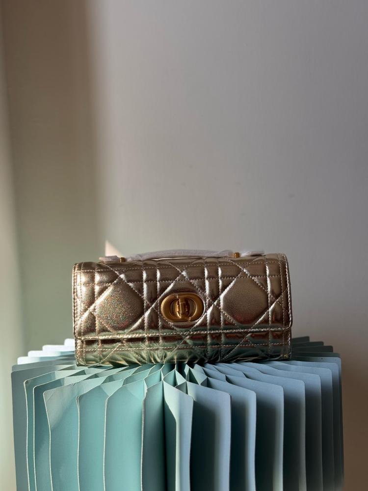 Add luxury and shine to your look with this 24 cm Dior leather clutch , crafted in a shiny metallic gold finish . Featuring a flap design with a top handle , this bag is the perfect choice for special occasions and lavish parties.