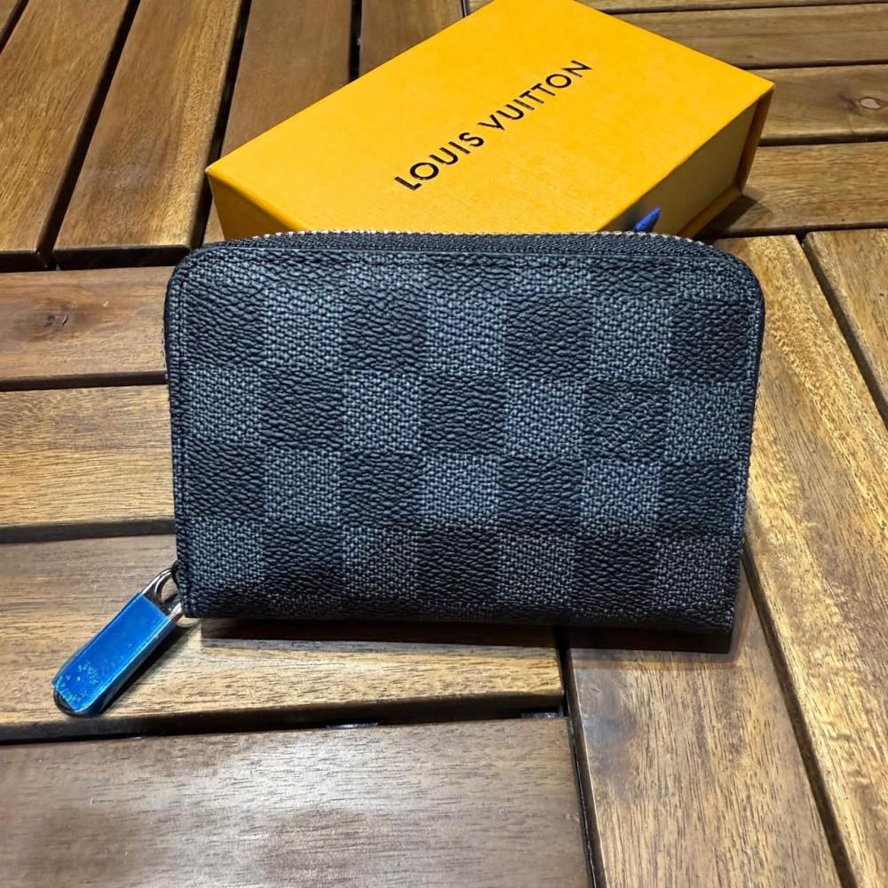 Get it now and add a touch of practical elegance to your day with the Louis Vuitton zippered wallet in navy check pattern .