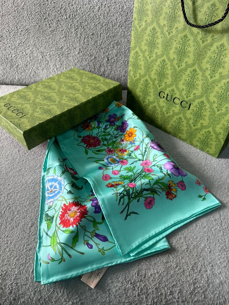 Wear color, choose style that speaks for you! This Gucci scarf embodies a charming harmony between fresh turquoise and a multi-colored floral print, making it more than just an accessory—it's a statement piece. Perfect for adding a vibrant touch to your everyday look or for special occasions.