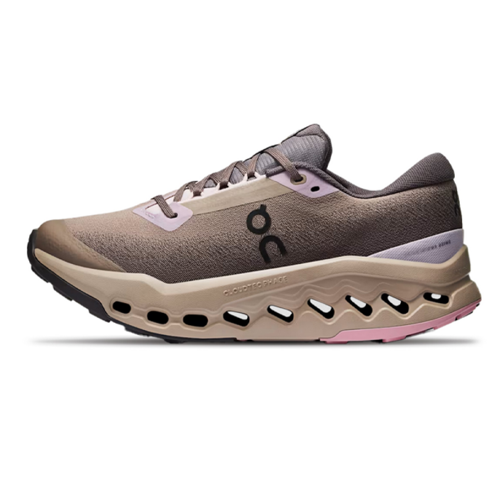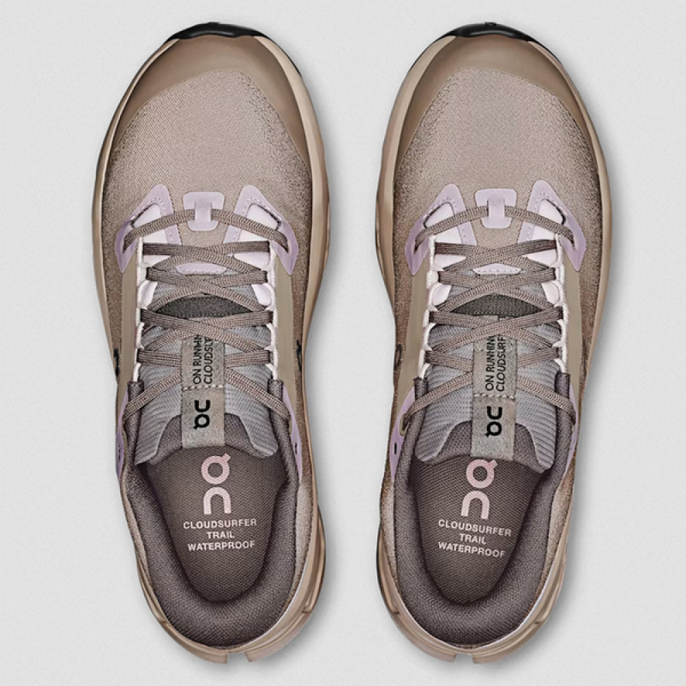 The Cloud Surfer Waterproof Shoes come in a stylish chocolate brown with pink accents . Their practical, waterproof design provides ideal protection on rainy days, with a lightweight comfort that makes you feel like you're walking on a cloud.