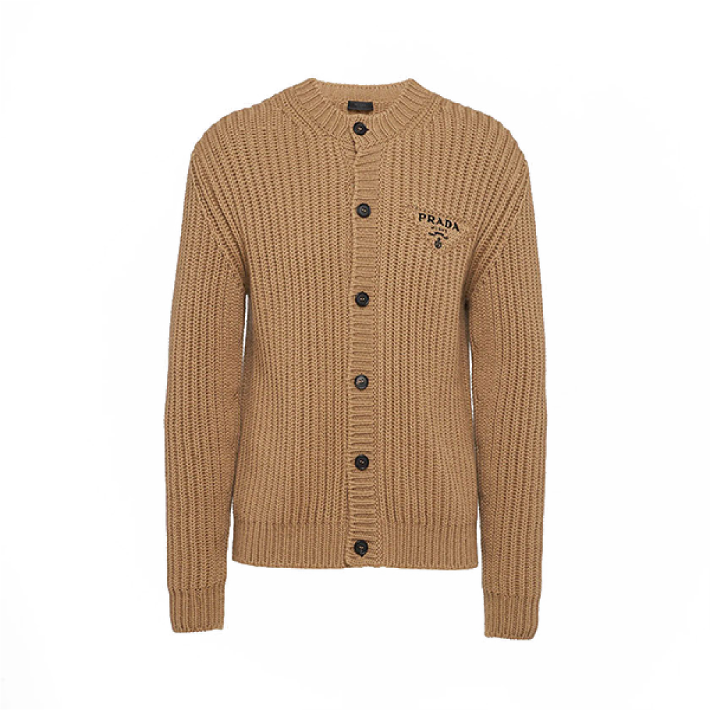 Crafted from finely woven yarns, this warm brown cardigan adds a touch of sophistication and warmth to any look. The classic design with a sleek, masculine cut gives you a confident presence, while the glossy black buttons add a touch of luxurious contrast. The delicately embroidered PRADA logo on the chest proudly expresses the brand's identity, reflecting its commitment to quality and meticulous detail.