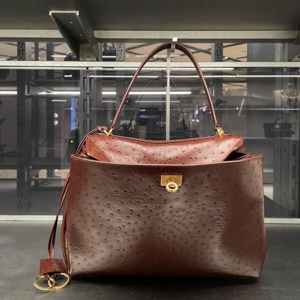 This classic Balenciaga Rodeo bag is crafted from premium leather in a warm brown hue and features elegant details like a metal lock that enhance its elegance and give it a modern touch.