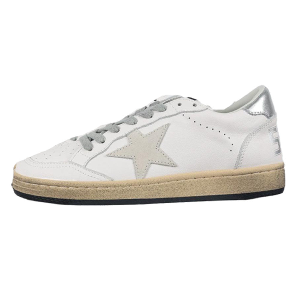 The Golden Goose Ball Star sneakers in white and silver balance comfort and modern style with their elegant silver sheen on a classic white base. They're an ideal choice for those who love distinctive shoes with luxurious details.