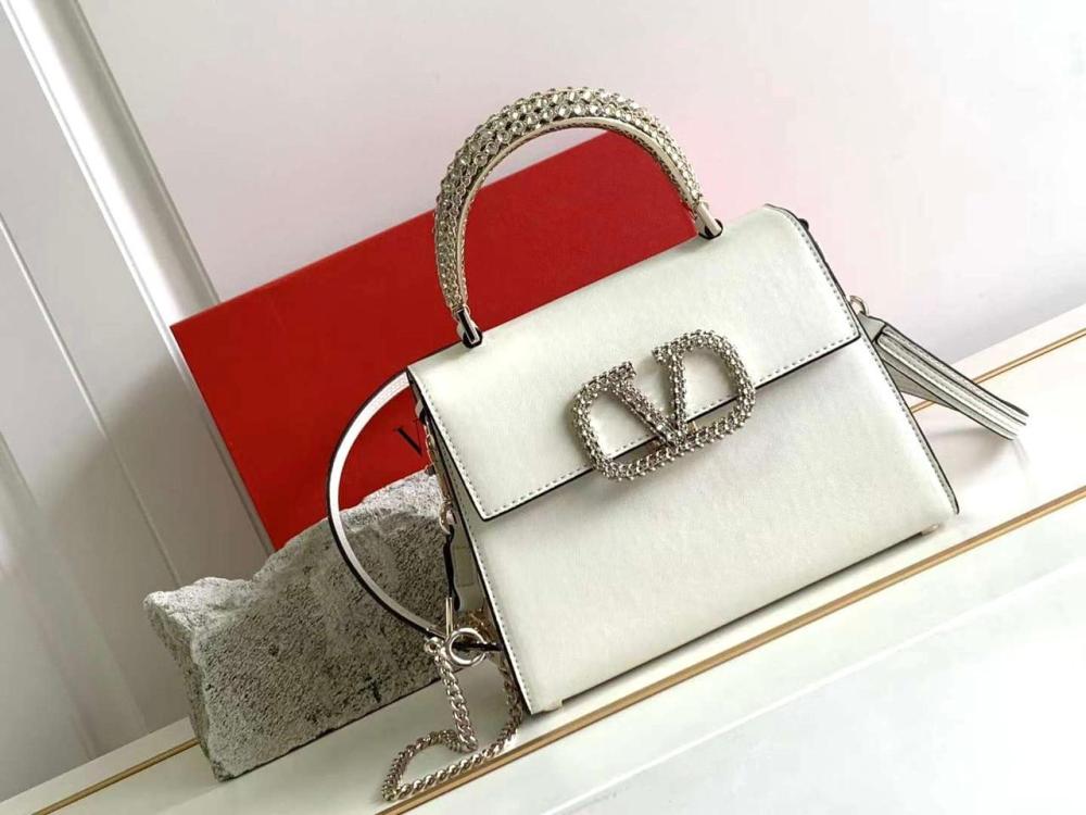 Discover the elegance embodied in the Valentino small handbag, where sophistication meets practicality in one design. Crafted from high-quality materials in a crisp white color, it features a silver handle and strap for a touch of sparkle.