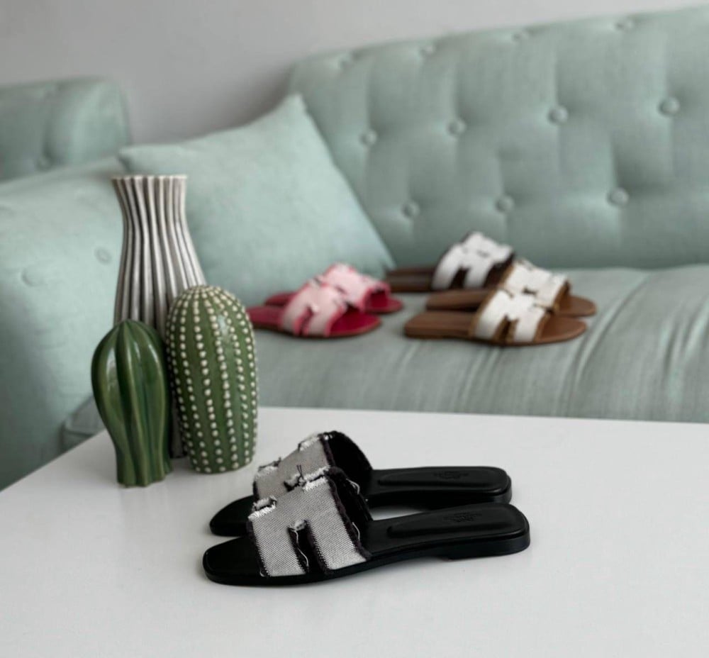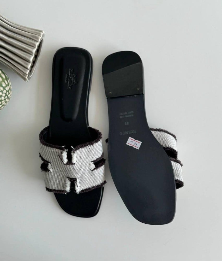The New Hermes women's slipper features an elegant design that harmoniously combines black and white, giving it a luxurious and aesthetic touch. The black color lends it elegance and complementarity, while the white adds subtle details that highlight the beauty of the design.