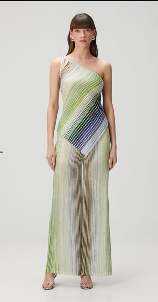 An elegant women's set from Missoni consisting of a shirt and a long skirt with an attractive striped design that combines shades of blue and green , reflecting the Italian house's unique style of mixing colors and patterns in a modern and elegant way.