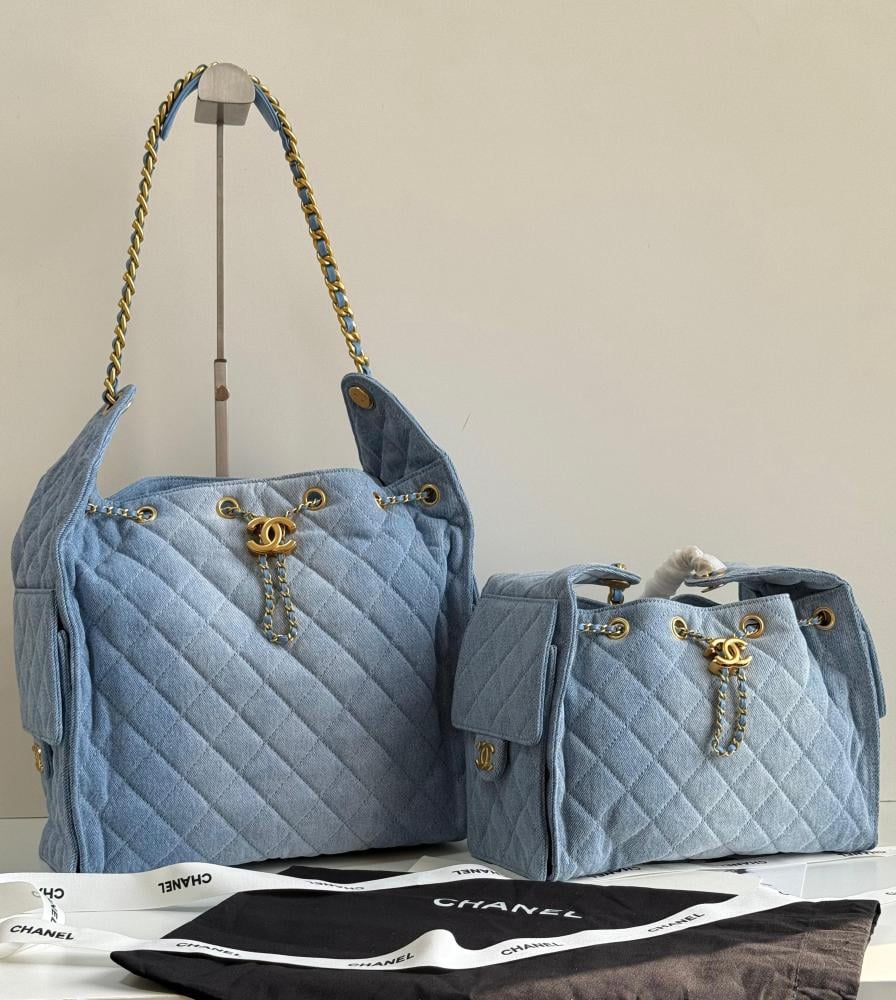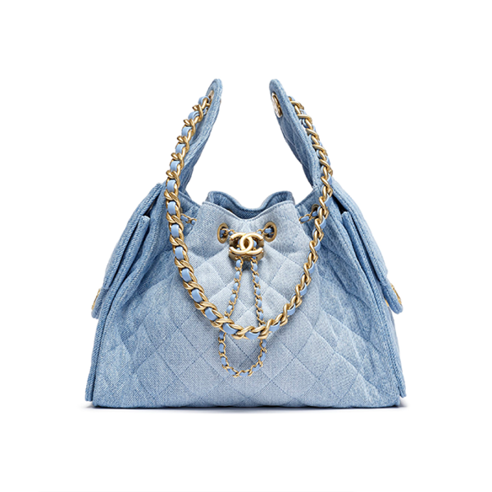 حقيبة شانيل 25 هاند باق جينز – لون أزرق مع سلسلة كتف ذهبية