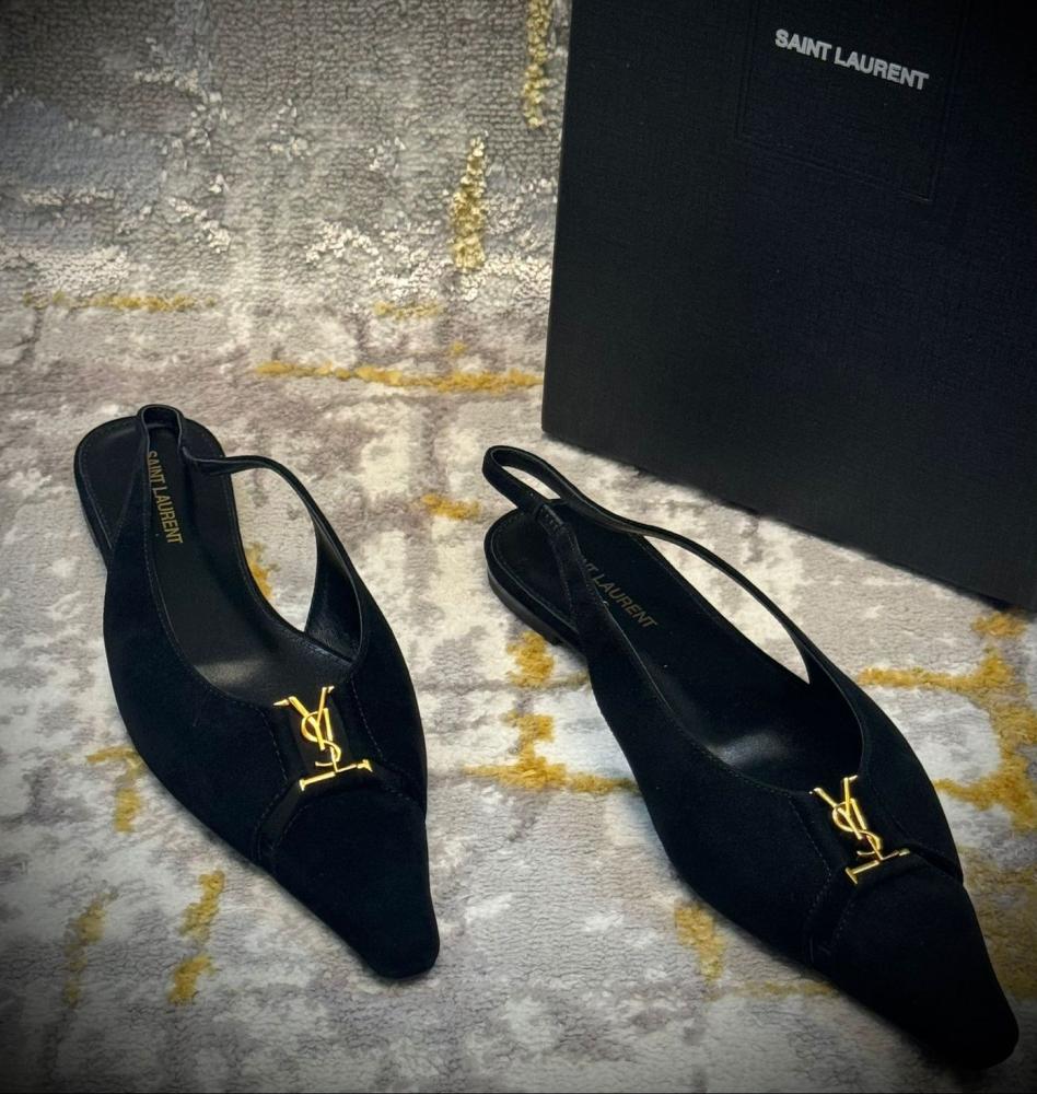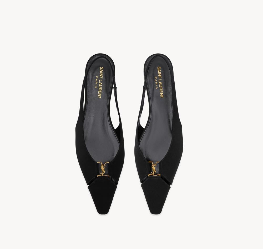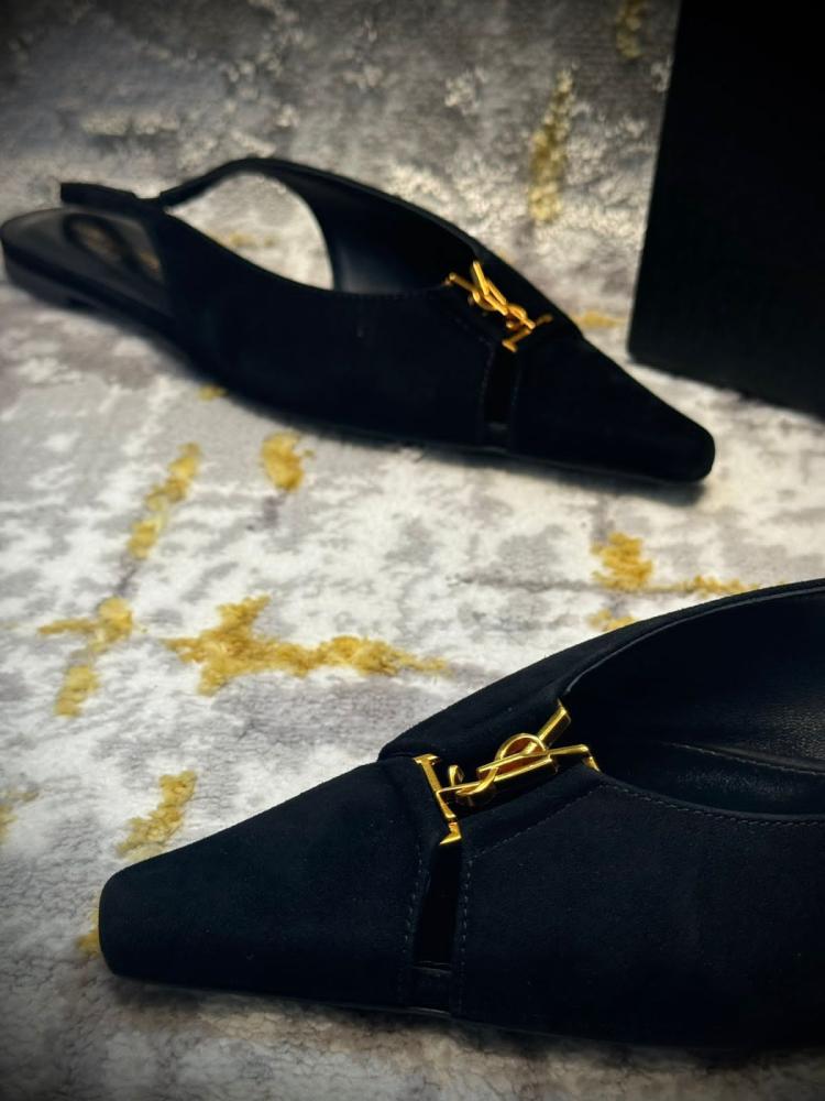 Add a touch of luxury to your steps with the Saint Laurent flat sandal, designed in elegant black to reflect sophisticated simplicity. Featuring a comfortable back strap for optimal support, it's embellished with the iconic gold YSL logo, adding a luxurious touch suitable for all occasions.