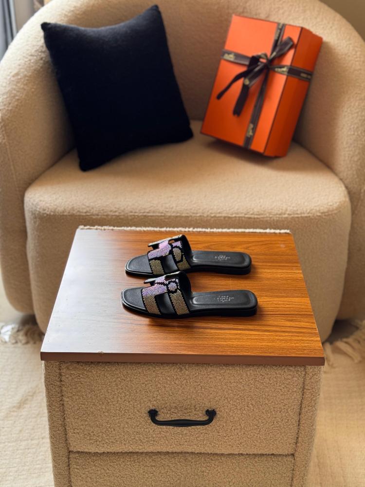 Hermes Oran Flat Slides in Black with Rainbow Rhinestones