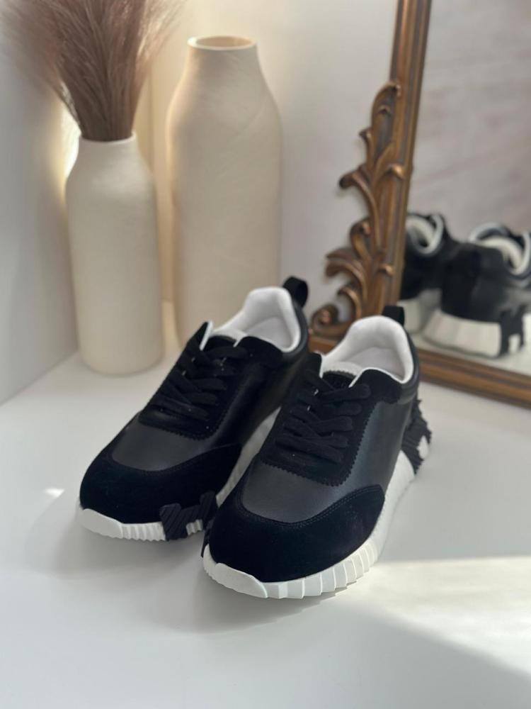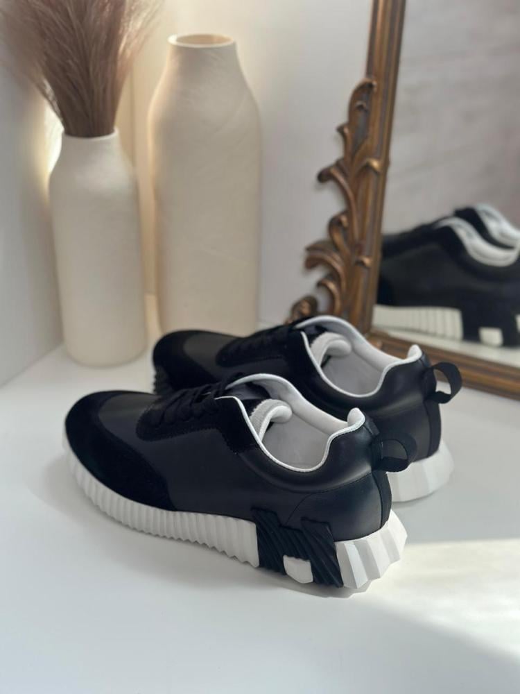 Experience luxury with these Hermes Bouncing men's sneakers, carefully crafted to combine modern design with practicality. The shoe features a combination of premium suede and smooth black leather, giving it a distinctive look that's timeless. The prominent white sole adds a stylish contrast and ensures agility and stability, making it ideal for everyday activities and casual occasions.
