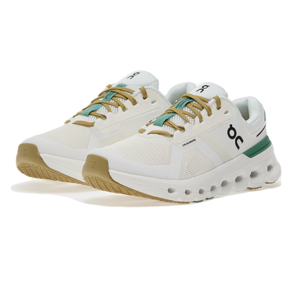 The On Cloudrunner 2 Undyed Green unisex shoe from On combines stylish design with practicality, featuring a distinctive natural white and green colorway free of dyes for a clean, minimalist look. These sneakers are specially crafted to provide superior comfort thanks to CloudTec technology, which provides superior cushioning with every step and helps absorb shock effectively.