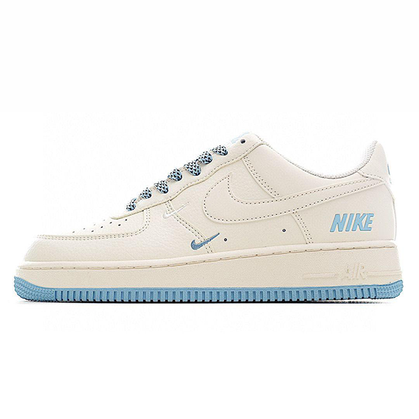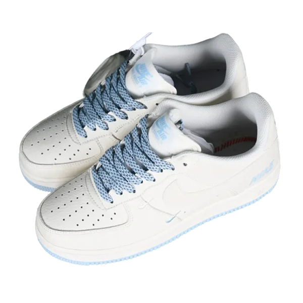 Enjoy style and performance with the Nike Air Force 1 flat sports shoes, featuring a stunning white design with sky blue accents!