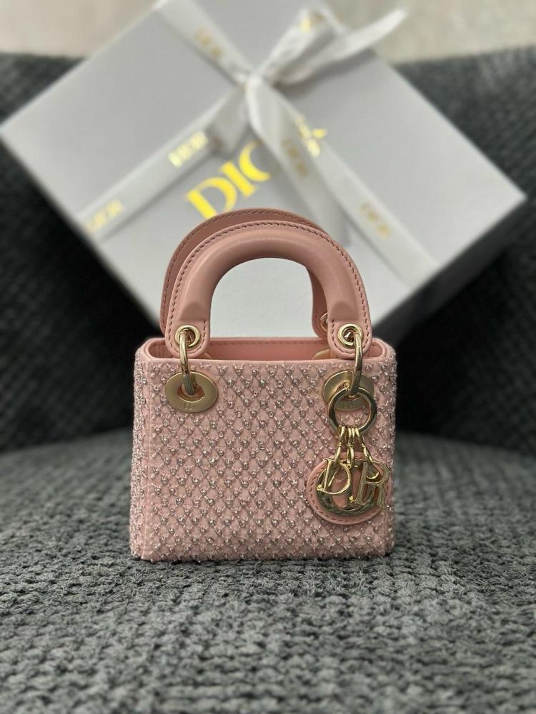 The Micro Lady Dior handbag combines luxury with meticulous detailing, making it your perfect choice for an elegant and striking look. It's embellished with sparkling soft pink crystals, adding a touch of femininity and sophistication to the design. Its compact size makes it ideal for carrying your essentials, while its modern shape gives you a stylish and distinctive look for any occasion.