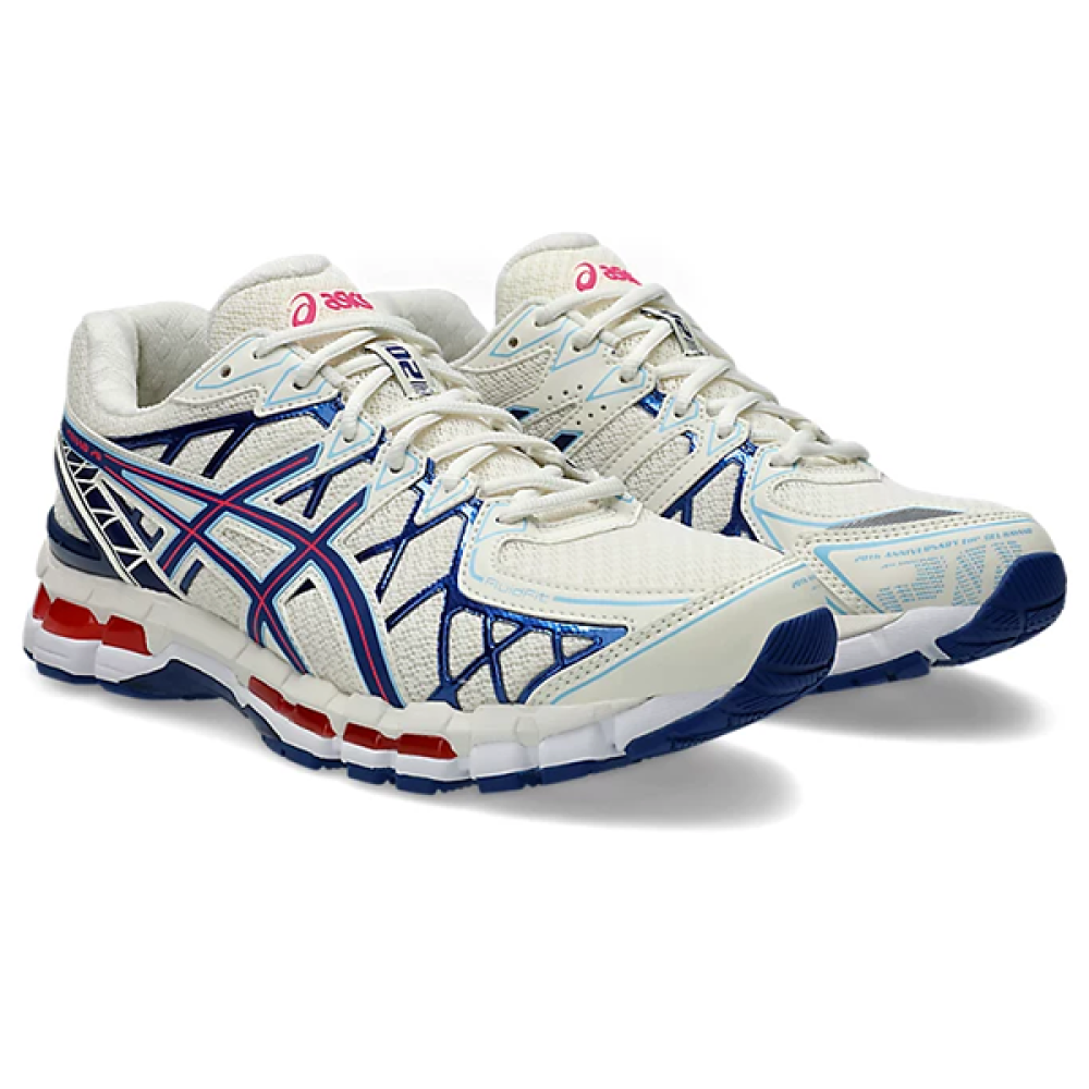 Elevate your running with the Asics Gel-Kayano 20 in shades of white, night blue, and vibrant red, a design that combines superior comfort and advanced support for stability and power with every step.