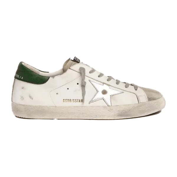 Update your look with modern style and ultimate comfort with the Golden Goose Super Star sports sneaker in gray, white, and green.